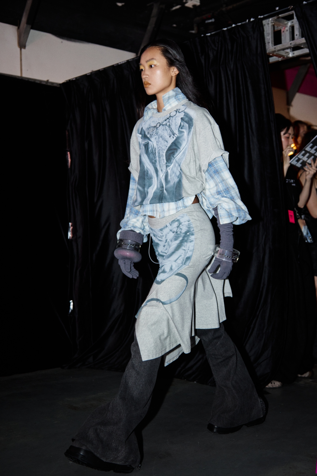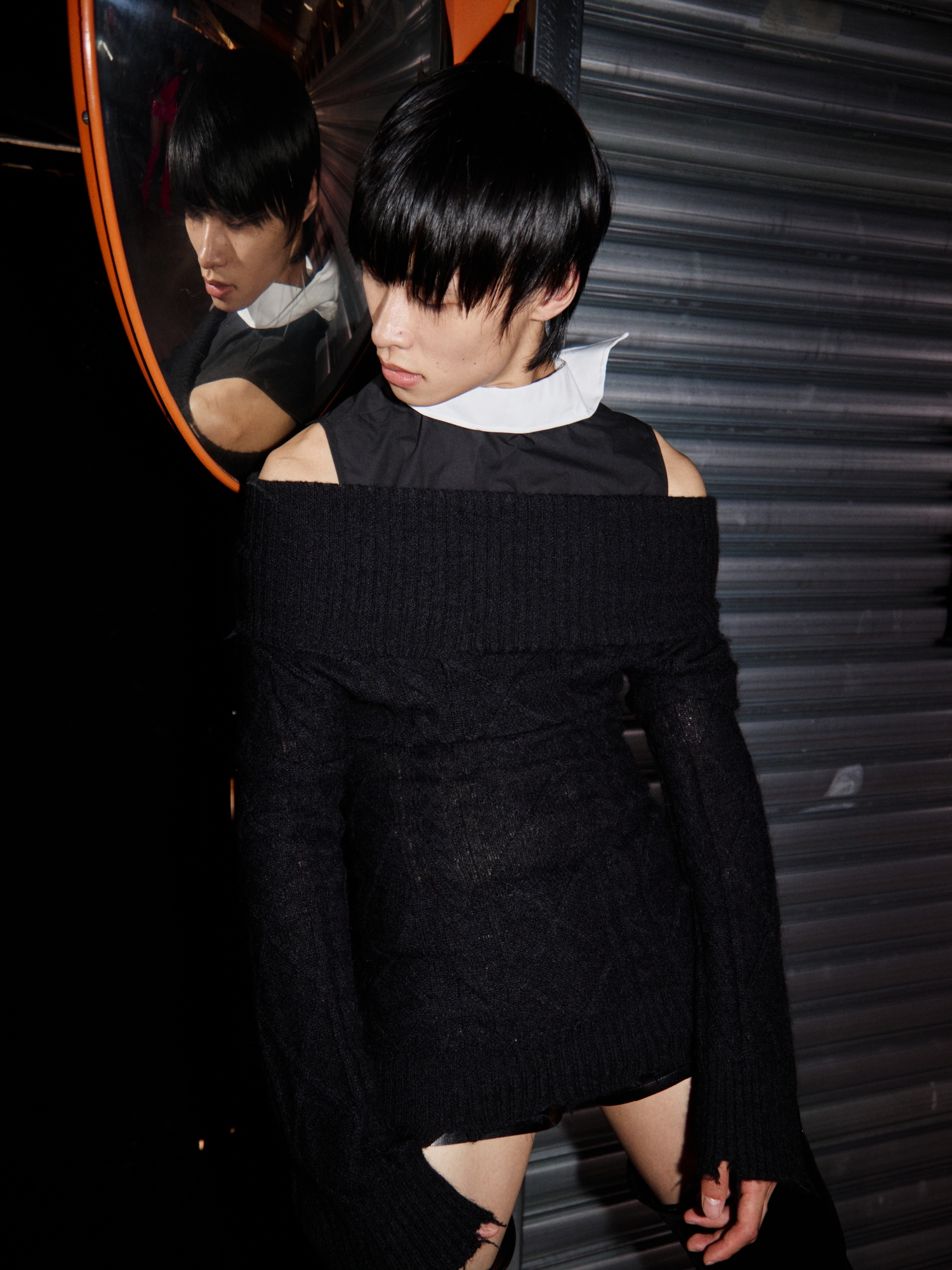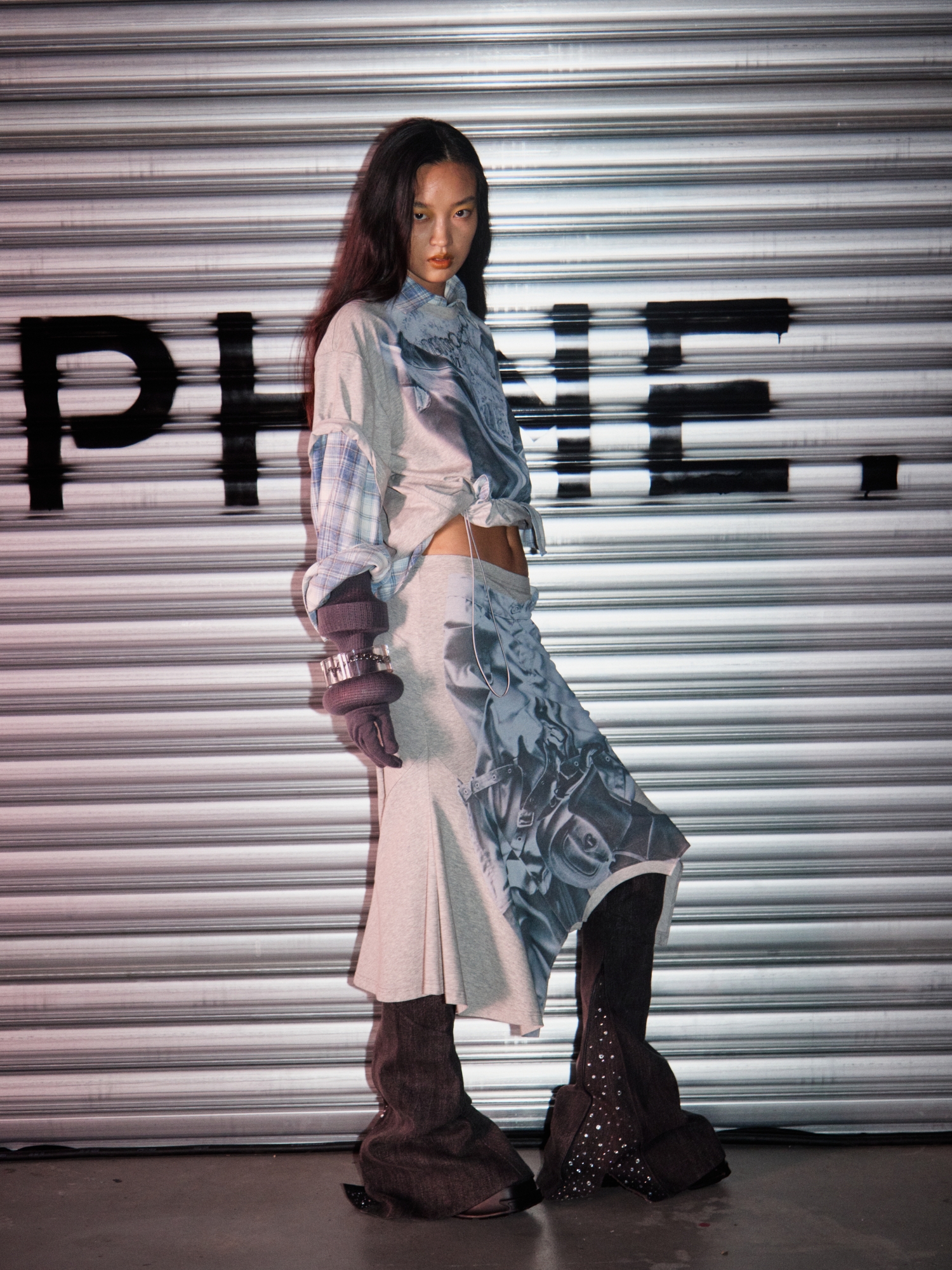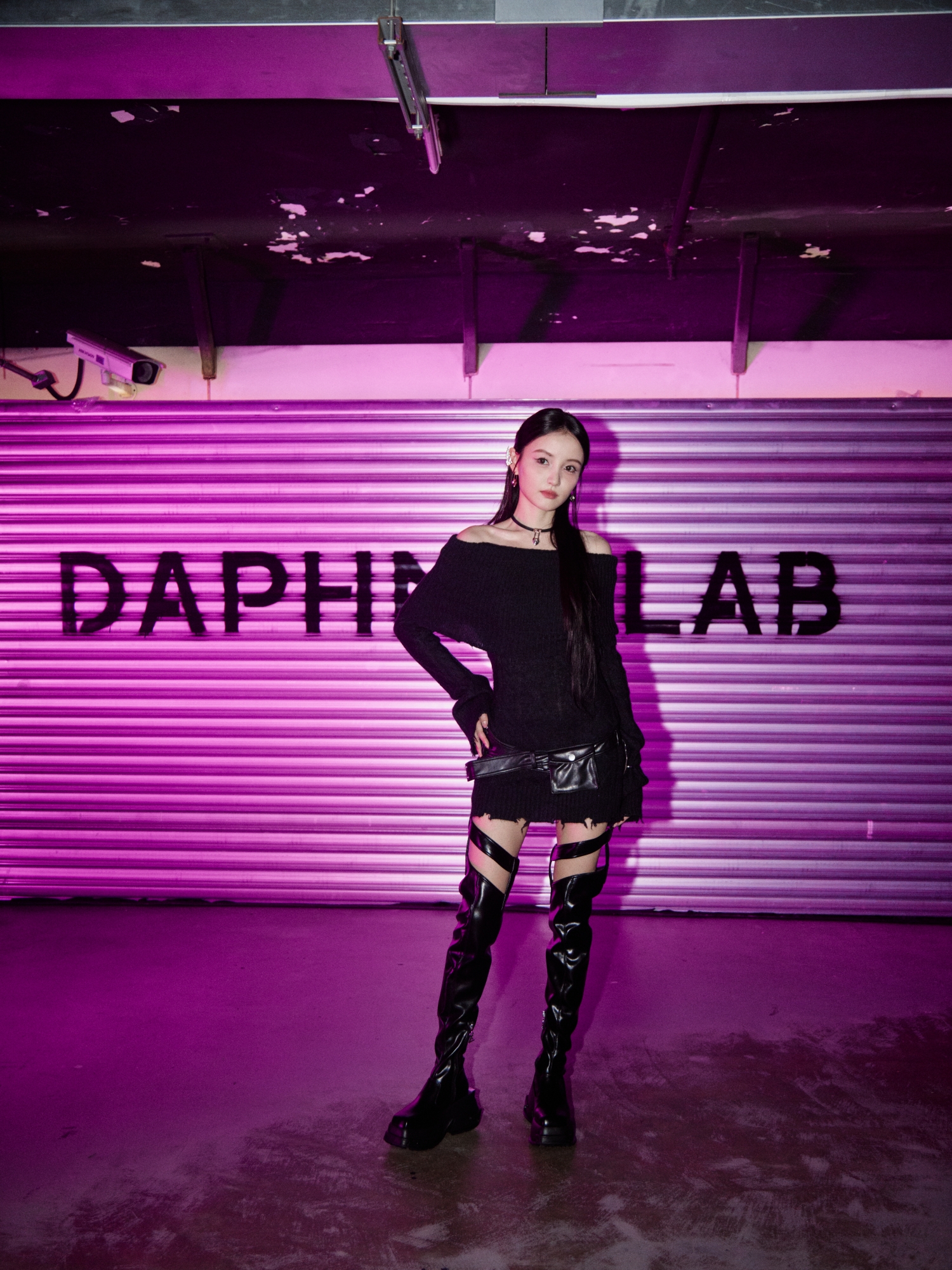 Designer duo Marrk and Shitian from MARRKNULL infused their distinctive deconstructed sensibility into DAPHNE.LAB's bold, youth-oriented approach. The result is a collision of raw experimentation and refined craft, a wardrobe designed for a generation learning to find grace in disorder.
