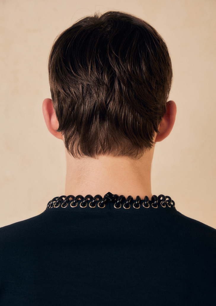 Telephone receivers are a motif we can see all throughout the collection, depicting human communication, more specifically the shifting nature of relationships: sometimes close, sometimes far. The theme of 'two' also often repeats itself again and again. We see two holes, two wisdom teeth, t-shirts made for two, illustrating how different elements can coexist, and even complement each other.