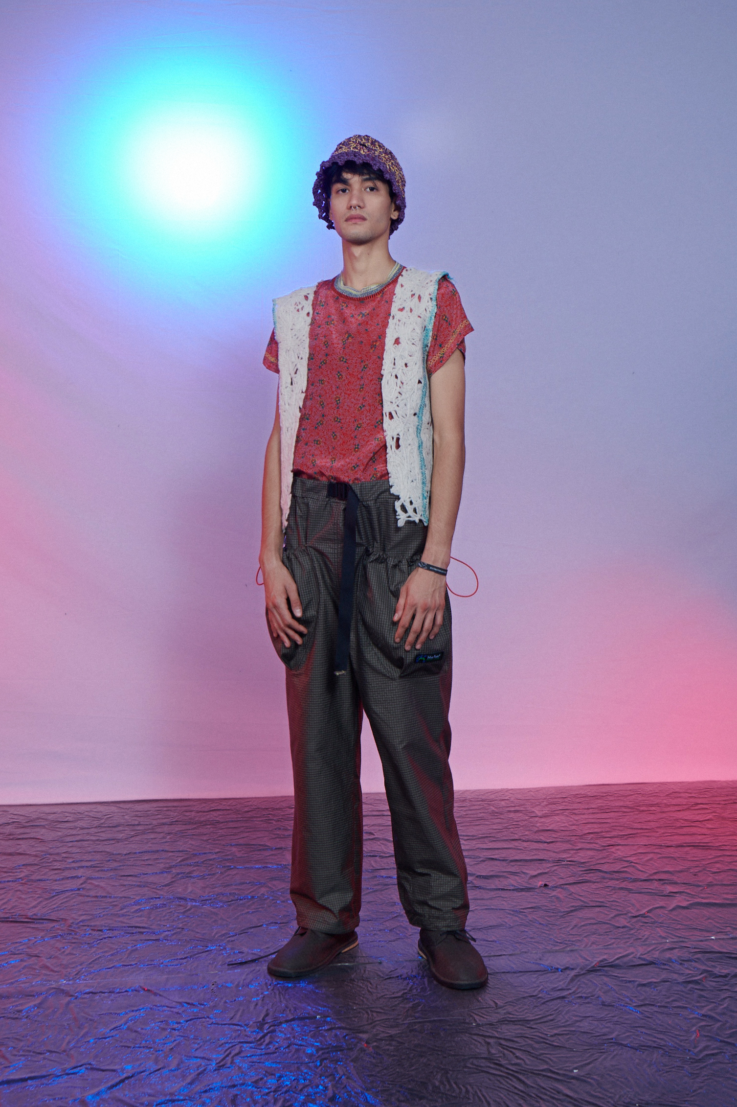 Rayon Vert est une ligne de vêtements basée sur la recherche, fondée par Yuri Kaban et Pietro Fareri en 2017, dont l'idée a germé lors d'un tour à vélo sur la côte adriatique et d'un voyage d'escalade dans les Alpes. Les deux créateurs ont combiné leur passion commune pour les sports de plein air dans une ligne d'équipements, de sacs à dos et de vêtements destinés aux aventures dans la nature, exclusivement faits à la main. Avec Vitelli, l'hybridation joue sur les contrastes entre la rugosité des matériaux techniques et le toucher doux et élégant des tissus et des tricots. En utilisant les chutes de Vitelli, Rayon Vert met de côté son approche minimale pour adopter des codes plus délicats: les deux marques s'influencent mutuellement pour créer des sacs à dos, des chemises, des pantalons et un poncho "Doomboh" aux proportions exagérées où la laine caractéristique de Vitelli offre une touche de douceur tout en conservant la fonctionnalité du vêtement.
